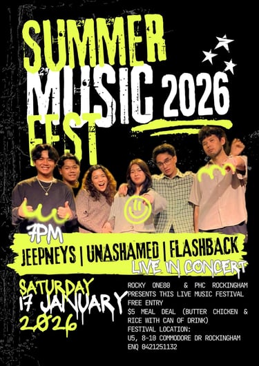 Presented by Rocky One80 & PHC Rockingham, this festival is open to everyone. Come with your friends, meet new people, and experience the joy and freedom found in Christ.